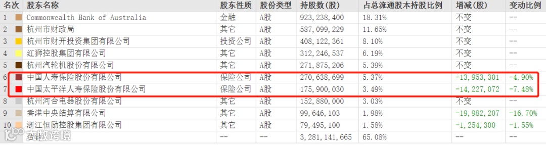 注:截至2021年三季度末,杭州银行前十大股东中的两家险资均有减持举动