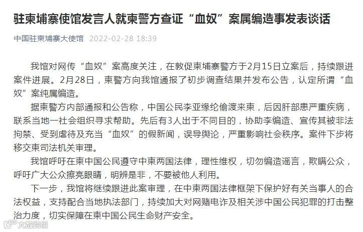 近日,有关“中国公民在柬埔寨被网赌集团圈养、充当‘血奴’”的报道引起广泛关注。2月28日,中国驻柬埔寨大使馆发言人就柬警方查证“血奴”案属编造事发表谈话。