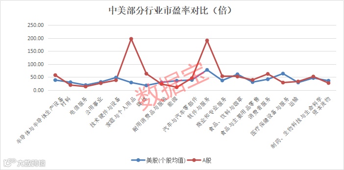 对标美股市场发现,A股部分行业估值较高,以科技、汽车等为主,比如半导体与半导体生产设备行业为例,美股市盈率(个股均值)低于40倍,A股接近60倍,软件与服务行业,美股市盈率78倍,A股超过190倍。