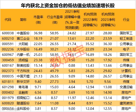 相关人士认为,2022年在维持震荡的行情下,低估值绩优、蓝筹、核心资产等或在轮动中迎来机会。数据宝统计,以最新收盘日统计(剔除医药、金融板块),个股估值低于对应行业估值,且2021至2023年净利润增速持续增加,北上资金开年以来加仓的个股仅有15只。这15股的业绩特征相对明显,虽增速不高,但很稳定,仅中直股份、太阳能2021年净利润增幅或超过20%。