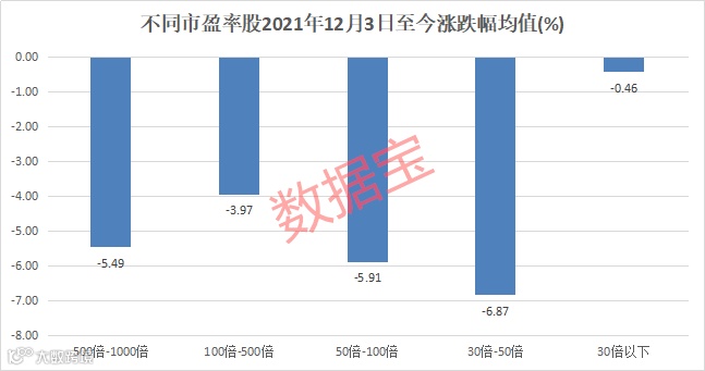 不过在对估值进行分析后发现,上述原因中的第三点对股价有显著影响。证券时报·数据宝统计,将最新市盈率按照范围划分,30倍以上股跌幅远超30倍以下股,其中30倍以下股去年12月3日以来仅平均下跌0.46%,500倍至1000倍股同期跌幅超过5%。