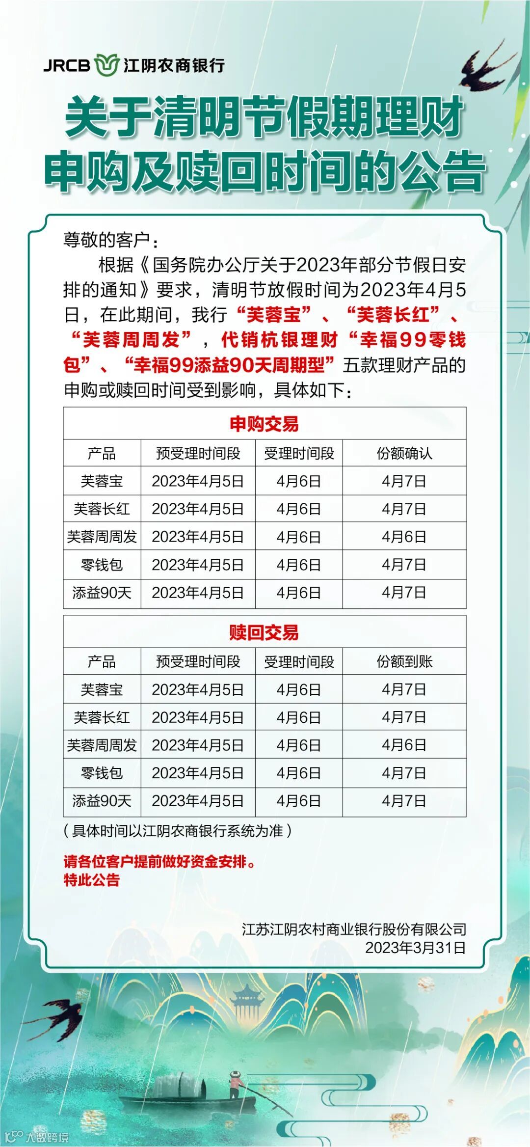 理财 | 关于清明节假期理财申购及赎回时间的公告