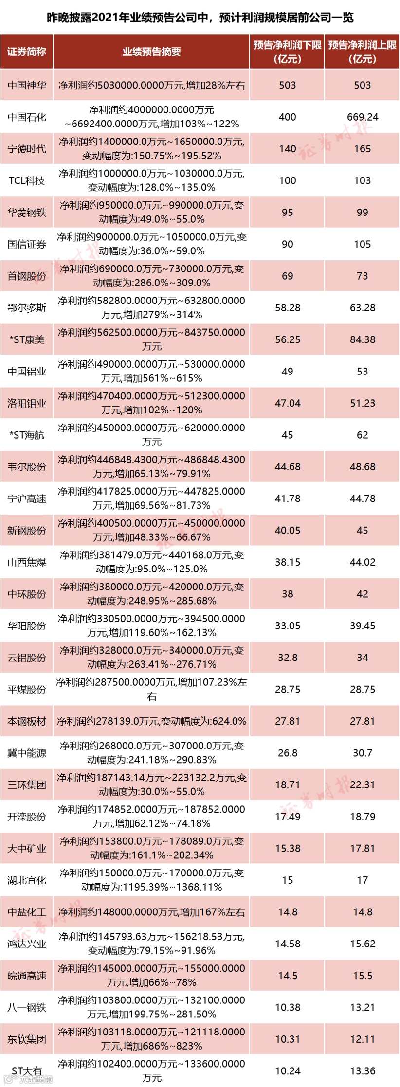中国神华是昨晚发布业绩预告的公司中,盈利最高的一家公司。公司发布的2021 年度业绩预告显示,按中国企业会计准则,2021 年度归属于公司股东的净利润约503 亿元,同比增长约28%,2021 年度归属于公司股东的扣除非经常性损益的净利润约500亿元,同比增长约31%。