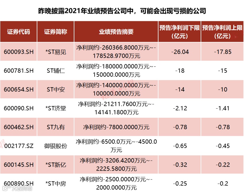 据Wind数据,昨晚共有183家公司披露2021年报业绩预告,若按照预告净利润下限计算,有8家公司预计出现亏损,占比约4.4%。上述业绩预亏公司包括*ST易见、ST辅仁、ST中安、*ST济堂、ST九有、御银股份、*ST新亿、*ST中房。至此,发布年报业绩预告公司已超过1600家。