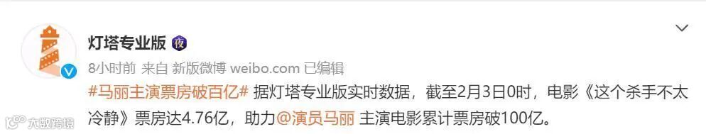 @灯塔专业版 当天也发布消息称,据灯塔专业版实时数据,截至2月3日0时,马丽主演的春节档电影《这个杀手不太冷静》票房达4.76亿。