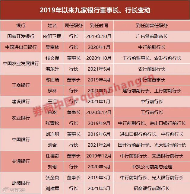 近年来,国有大行行领导人选变动明显提速,前期赴地方担任金融副省长的金融业干部陆续回归金融系统,在银行、金融监管部门等担任要职。随着近两年金融系统陆续有数位干部到龄卸任,可以预见,银行业人事密集变动的趋势还要持续一段时间。