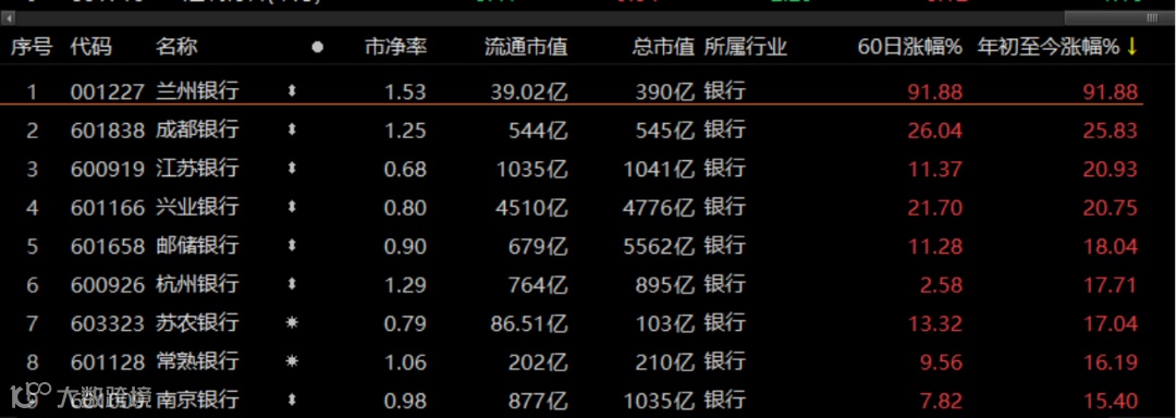 券商中国记者注意到,2022年以来,A股银行板块中除次新股兰州银行涨幅达91.88%外,成都银行、江苏银行、兴业银行涨幅均超20%。此外,国有大行邮储银行,上涨18.04%,涨幅居于各大国有银行之首。杭州银行、苏农银行、常熟银行、南京银行的涨幅均超15%。