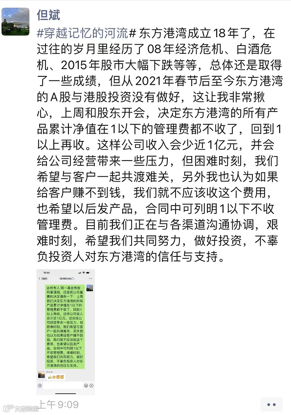 “上周和股东开会,决定东方港湾的所有累计净值低于1的产品将不在收取管理费,待净值回升1以上再收取。但斌表示,这一决定将会使公司的收入减少近1亿元,给公司经营带来压力。但困难时刻,我们希望与客户一起共渡难关,另外我也认为如果给客户赚不到钱,我们就不应该收这个费用,也希望以后发产品,合同中可列明1以下不收管理费。”