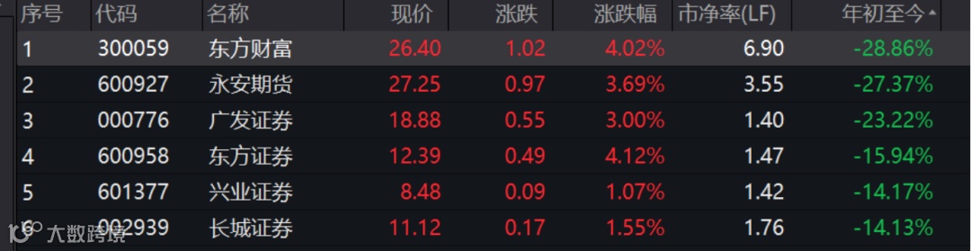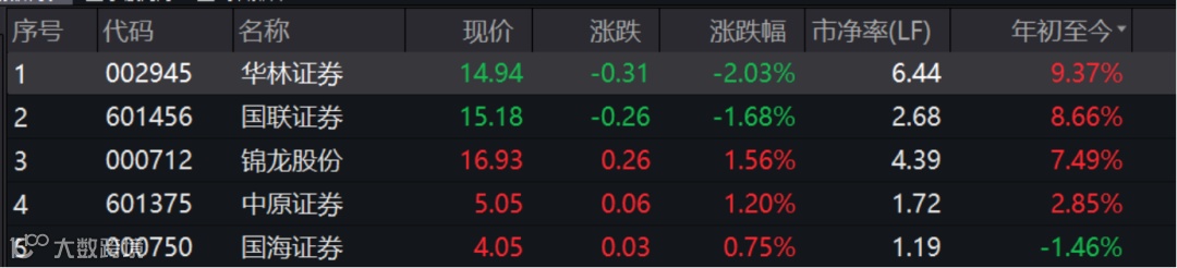 与之对应的是,华林证券、国联证券、锦龙股份和中原证券中小券商上涨,今年以来分别上涨9.37%、8.66%、7.49%和2.85%。