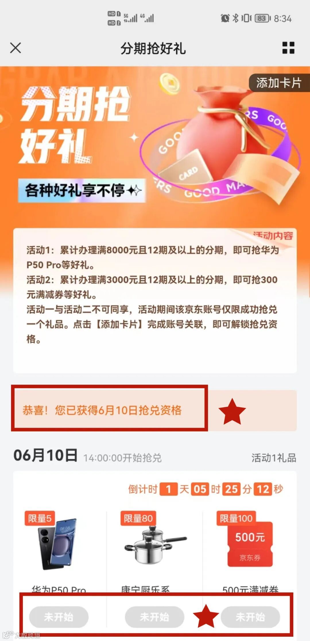 3、礼品领取路径:京东金融APP-【信用卡】-分期抢好礼