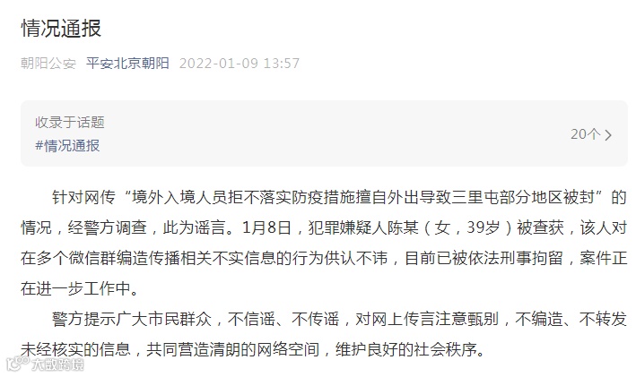 据平安北京朝阳,网传“境外入境人员拒不落实防疫措施擅自外出导致三里屯部分地区被封”的情况,经警方调查,此为谣言。1月8日,犯罪嫌疑人陈某(女,39岁)被查获,该人对在多个微信群编造传播相关不实信息的行为供认不讳,目前已被依法刑事拘留,案件正在进一步工作中。