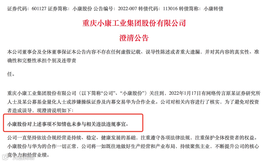 面对质疑,小康股份18日早间发布澄清公告,17日有网络传言原某证券研究所人士及某公募基金量化人士或涉嫌操纵证券及内幕交易华为合作企业。公司对相关内容进行了核实,对上述事项不知情也未参与相关违法违规事宜。