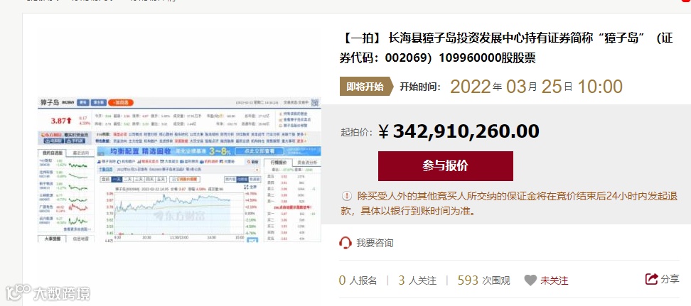 獐子岛2月23日晚公告显示,公司接到控股股东长海县獐子岛投资发展中心通知,获悉其所持公司1.0996亿股股份(占公司总股本的15.4631%)将于今年3月25日10时至26日10时止(延时的除外)在北京产权交易所网络司法拍卖平台上进行公开拍卖活动。如本次拍卖交易成交,将会导致公司控股股东和实际控制人发生变化。经协商,拍卖起拍价为3.43亿元。保证金3500万元,增价幅度为100万元(或其整数倍)。据北京产权交易所拍卖平台显示,自公示以来截至2月24日晚7点,该拍卖已经有3人关注、593次围观.