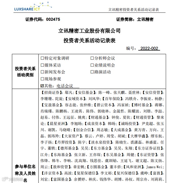 而在2月13日,立讯精密宣布造车后,也吸引了众多明星机构关注,当时参与机构有223家,易方达基金、广发基金、嘉实基金、南方基金等多家顶级公募参与调研,高毅资产、景林资产、淡水泉投资、重阳投资等头部私募机构也在列。