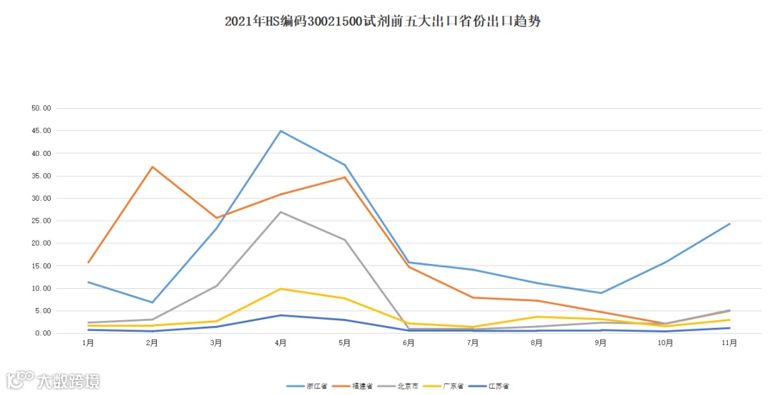 数据还显示,2021年4~5月份出口高峰期,浙江、福建和北京的出口量占据前三位,三地的出口量基本相当,相差不大。而到了2021年下半年,检测试剂的出口,迅速向浙江企业集中。譬如2021年11月,浙江的出口量,几乎相当于北京和福建4倍。