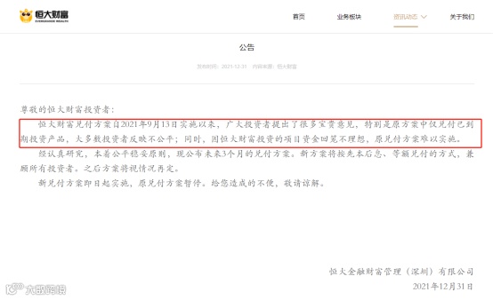 2021年最后一天,恒大财富突然宣布调整兑付方案。