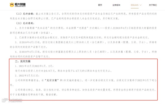 12月31日下午,恒大财富在官网披露公告称,现在公布未来3个月的兑付方案,新兑付方案即日起实施,原兑付方案暂停。