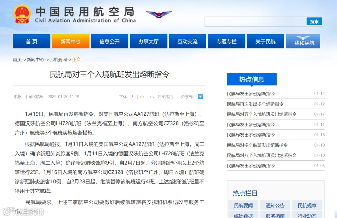 1月19日,民航局再发熔断指令,对美国航空公司AA127航班(达拉斯至上海)、德国汉莎航空公司LH728航班(法兰克福至上海)、南方航空公司CZ328(洛杉矶至广州)航班等3个航班实施熔断措施。