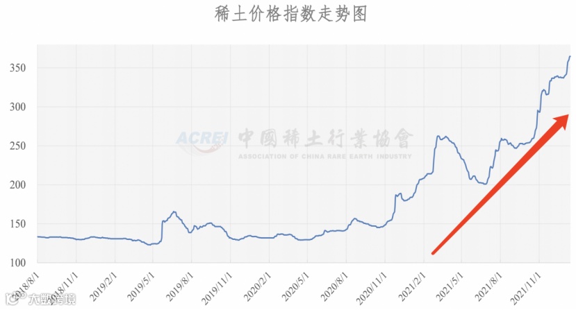 中国稀土行业协会监测的数据显示,截至1月13日,稀土价格指数为364.7点,较去年5月初的129.5点,累计涨幅已超过182%。