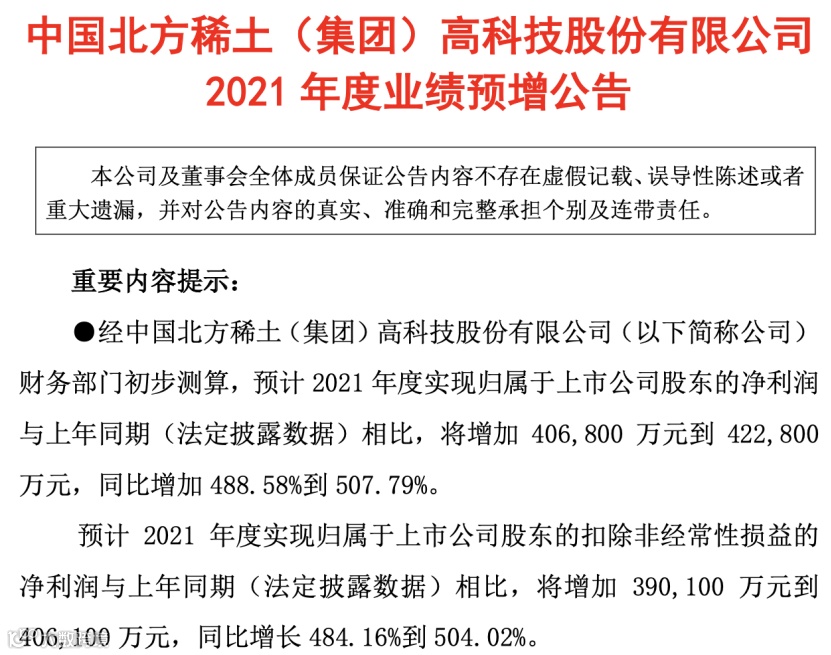 1月13日晚间,A股稀土赛道的牛股——北方稀土公布了2021年业绩预告,预计2021年度实现归属于上市公司股东的净利润增加40.68亿元到42.28亿元,同比增长488.58%到507.79%;归属于上市公司股东的扣除非经常性损益的净利润增加39.01亿元到40.61亿元,同比增长484.16%到504.02%