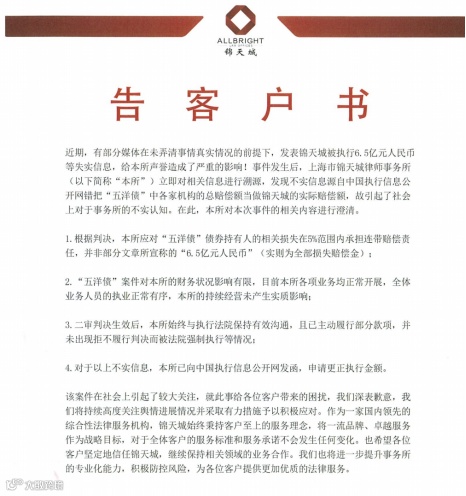 锦天城律所在该《告客户书》中表示,近期,有部分媒体在未弄清事情真实情况的前提下,发表锦天城律所被执行6. 5亿元人民币等失实信息,给锦天城律所声誉造成了严重的影响!事件发生后,锦天城律师事务所立即对相关信息进行溯源,发现不实信息源自中国执行信息公开网错把“五洋债”中各家机构的总赔偿额当做锦天城的实际赔偿额,故引起了社会上对于事务所的不实认知。