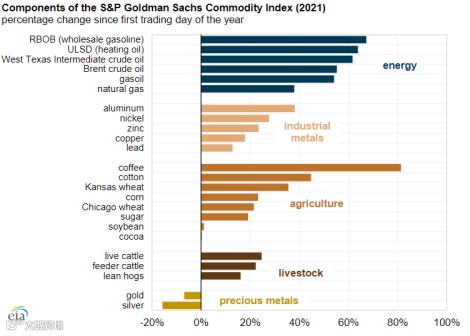 最重要的因素无疑是能源价格上涨。美国劳工统计局报告称,通胀的一半原因可归咎于能源价格的上涨。从整个2021年来看,纽约油价涨幅超过55%,创下12年来最大年度涨幅;布伦特油价上涨超过50%,创下5年来最大年度涨幅。能源商品的期货市场中,RBOB和ULSD(用作取暖油交易基准的超低硫柴油)等石油产品价格在2021年涨幅分别为67%和64%,柴油的期货价格上涨了54%,天然气价格在能源商品中涨幅最小,但也有38%的涨幅。