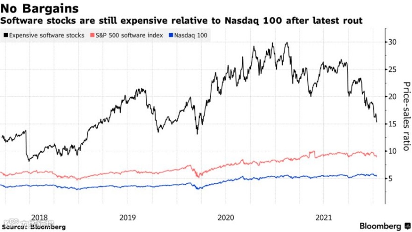 根据高盛集团编制的指数衡量,科技股价值较高位已经缩水三分之一。然后,据高盛统计,纳斯达克板块中一篮子尚未盈利的软件行业市销率仍有16倍,几乎是纳斯达克100指数的三倍。
