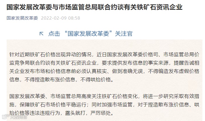 2月9日,国家发改委发布消息称,针对近期铁矿石价格出现异动的情况,近日国家发展改革委价格司、市场监管总局价监竞争局联合约谈有关铁矿石资讯企业,要求提供发布信息的事实来源,提醒告诫相关企业发布市场和价格信息前必须认真核实、做到准确无误,不得编造发布虚假价格信息,不得捏造散布涨价信息,不得哄抬价格。