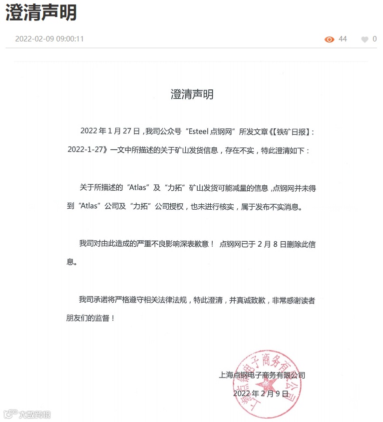 上海点钢的澄清声明对于公司在1月27日在微信公众号上所发文章,关于描述“Atlas”及“力拓”矿山发货可能减量的消息,并未得到“Atlas”及“力拓”公司授权,也未进行核实,属于发布不实信息。点钢网在2月8日删除此信息,并对由此产生的不良影响深表歉意。