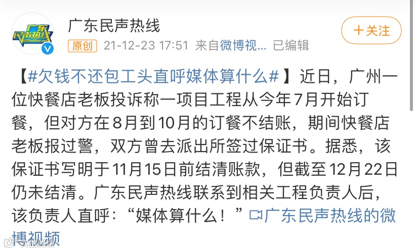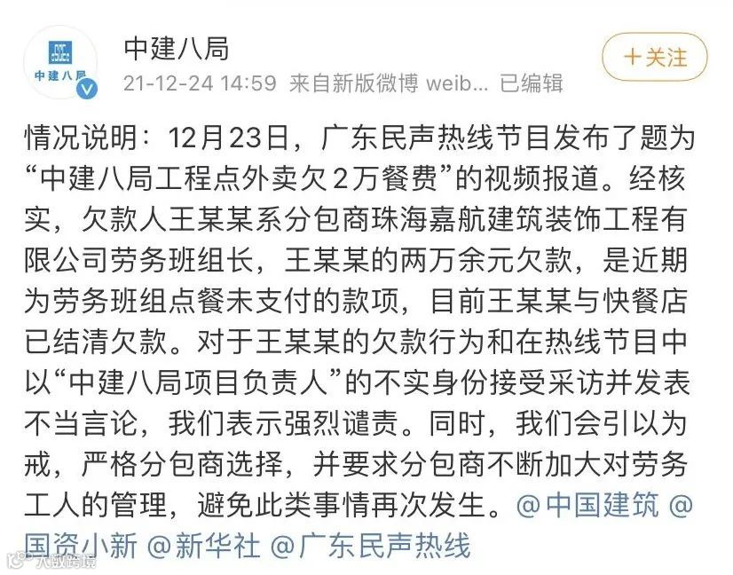 12月23日,广东民声热线节目发布了题为“中建八局工程点外卖欠2万餐费”的视频报道。经核实,欠款人王某某系分包商珠海嘉航建筑装饰工程有限公司劳务班组长,王某某的两万余元欠款,是近期为劳务班组点餐未支付的款项,目前王某某与快餐店已结清欠款。对于王某某的欠款行为和在热线节目中以“中建八局项目负责人”的不实身份接受采访并发表不当言论,我们表示强烈谴责。同时,我们会引以为戒,严格分包商选择,并要求分包商不断加大对劳务工人的管理,避免此类事情再次发生。