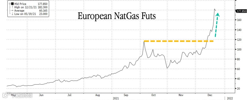 如其所言,欧洲再度上演了能源危机,危险级别远超今年9月。首先是,欧洲的天然气市场。当地时间周二,TTF基准荷兰天然气期货单日飙涨超20%,直接刷新了历史新高,一度涨至182欧元/兆瓦时,而在此前的7周时间内,欧洲大陆和英国的天然气期货已经走出了7连涨的惊人涨势,近一年的累计涨幅已超过729%。