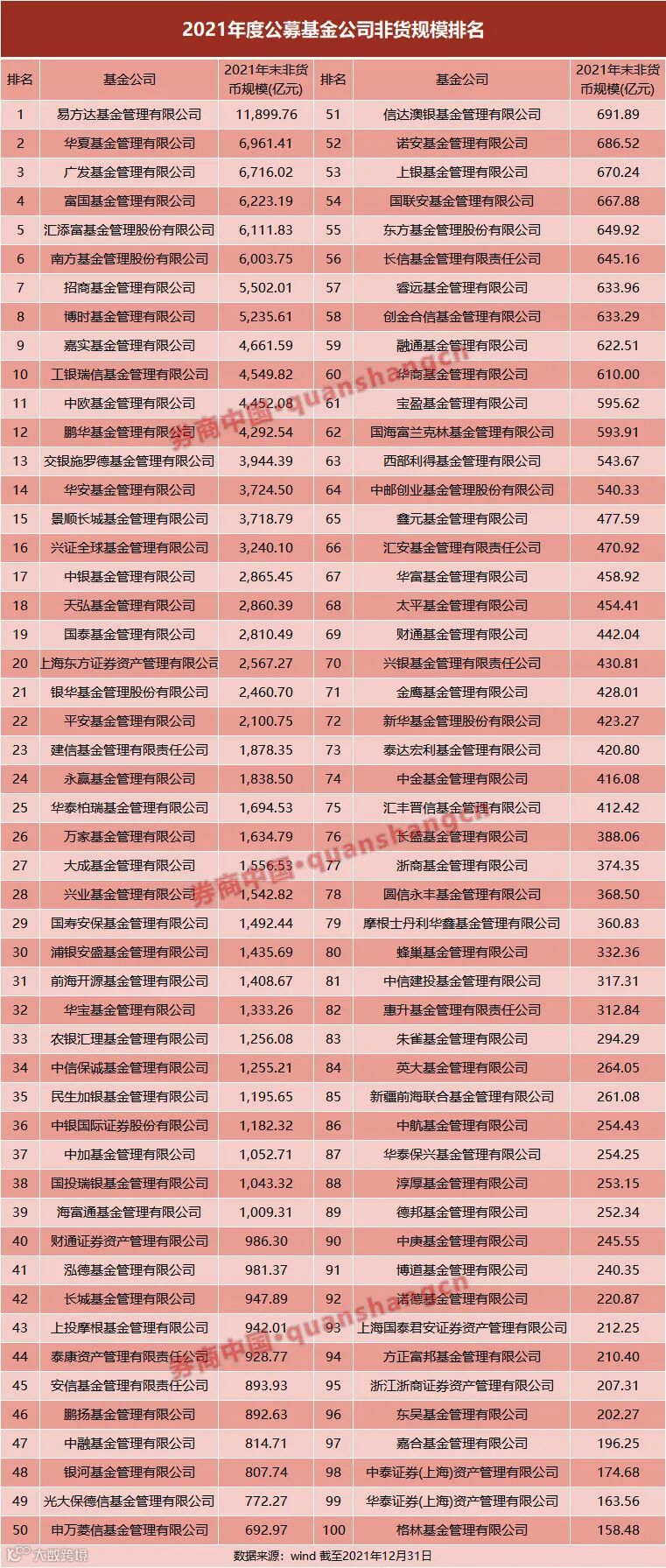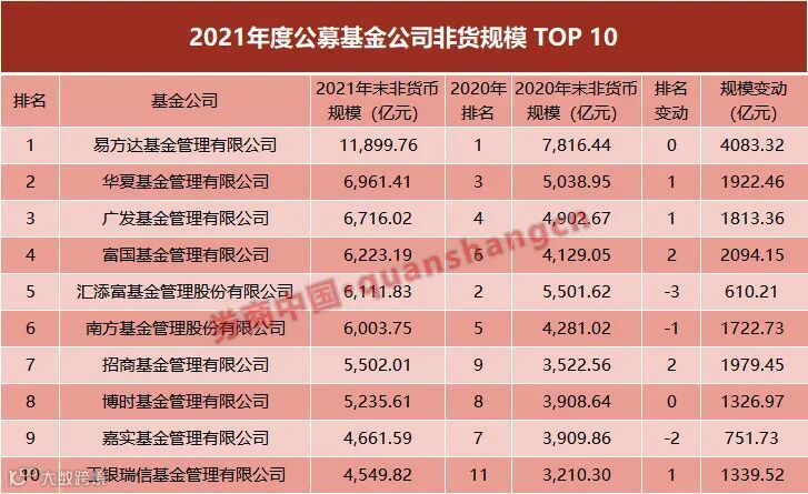 紧随其后,华夏基金位居次席,截至2021末的非货规模为6961.41亿元,比2020年末增长了1922.46亿元,排名上升1位;广发、富国、汇添富基金分列3~5名,非货规模都超过了6000亿元。