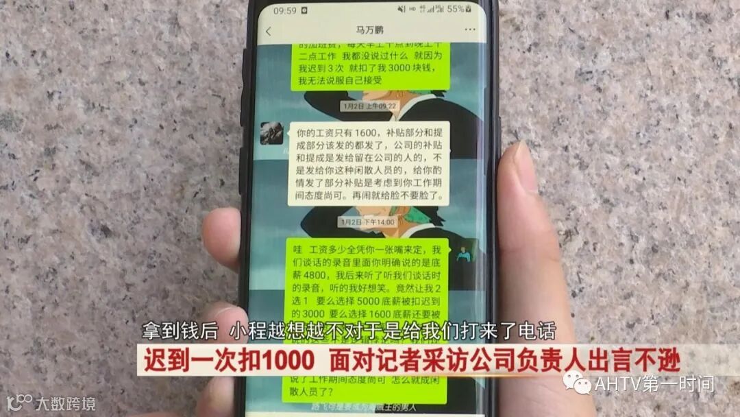 据九派新闻报道,6日,当地劳动部门赶赴公司所在地了解情况,现场做询问笔录。一名工作人员表示,合同上的工资是1600元,不违反最低工资,“如果真的(迟到一次扣1000),那肯定是不符合规定的;但是没有任何依据,嘴上讲扣你1万、扣你3万,那不管用,扣了还是没扣我们要拿实质证据”。