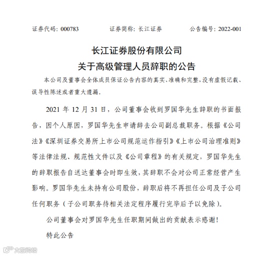 2021年12月31日,长江证券披露,该公司董事会收到罗国华先生辞职的书面报告,因个人原因,罗国华申请辞去该公司副总裁职务,辞职报告自送达董事会时即生效。