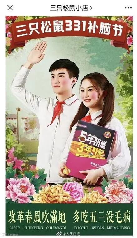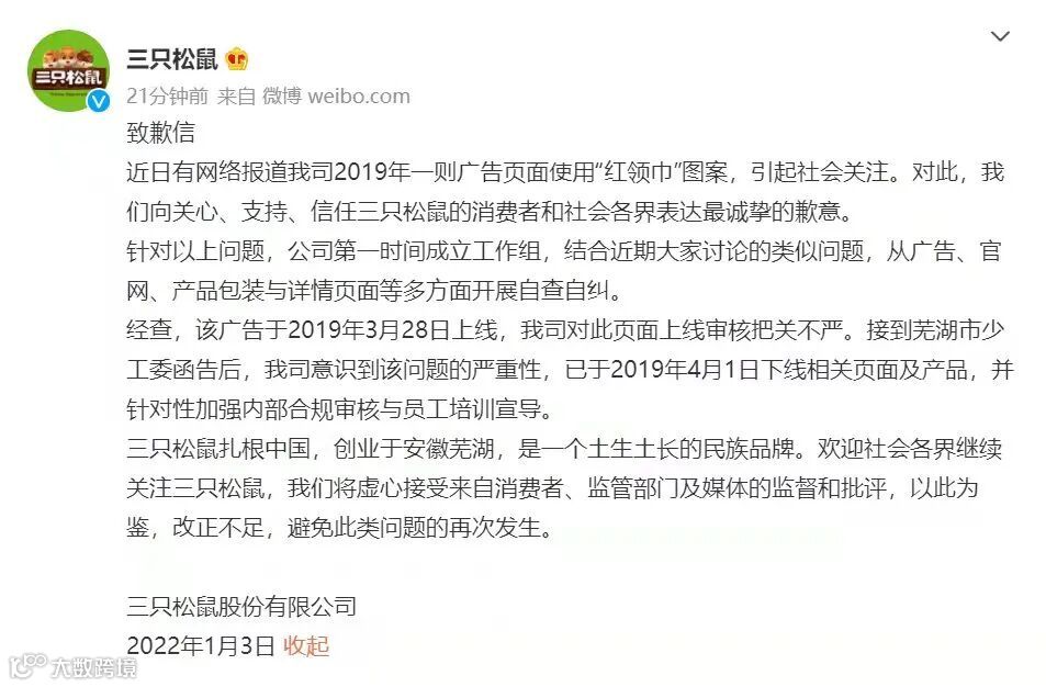 1月3日,针对在2019年发布的“331补脑节”广告图中使用“红领巾”画面一事,三只松鼠发布致歉信称,该广告于2019年3月28日上线,系公司对此页面上线审核把关不严。