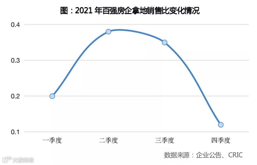 克而瑞研究中心统计,2021年百强房企新增土储拿地销售比仅为0.25,较2020年下降0.12,与2017年的高峰相比则降幅超过50%,并创下近五年新低。