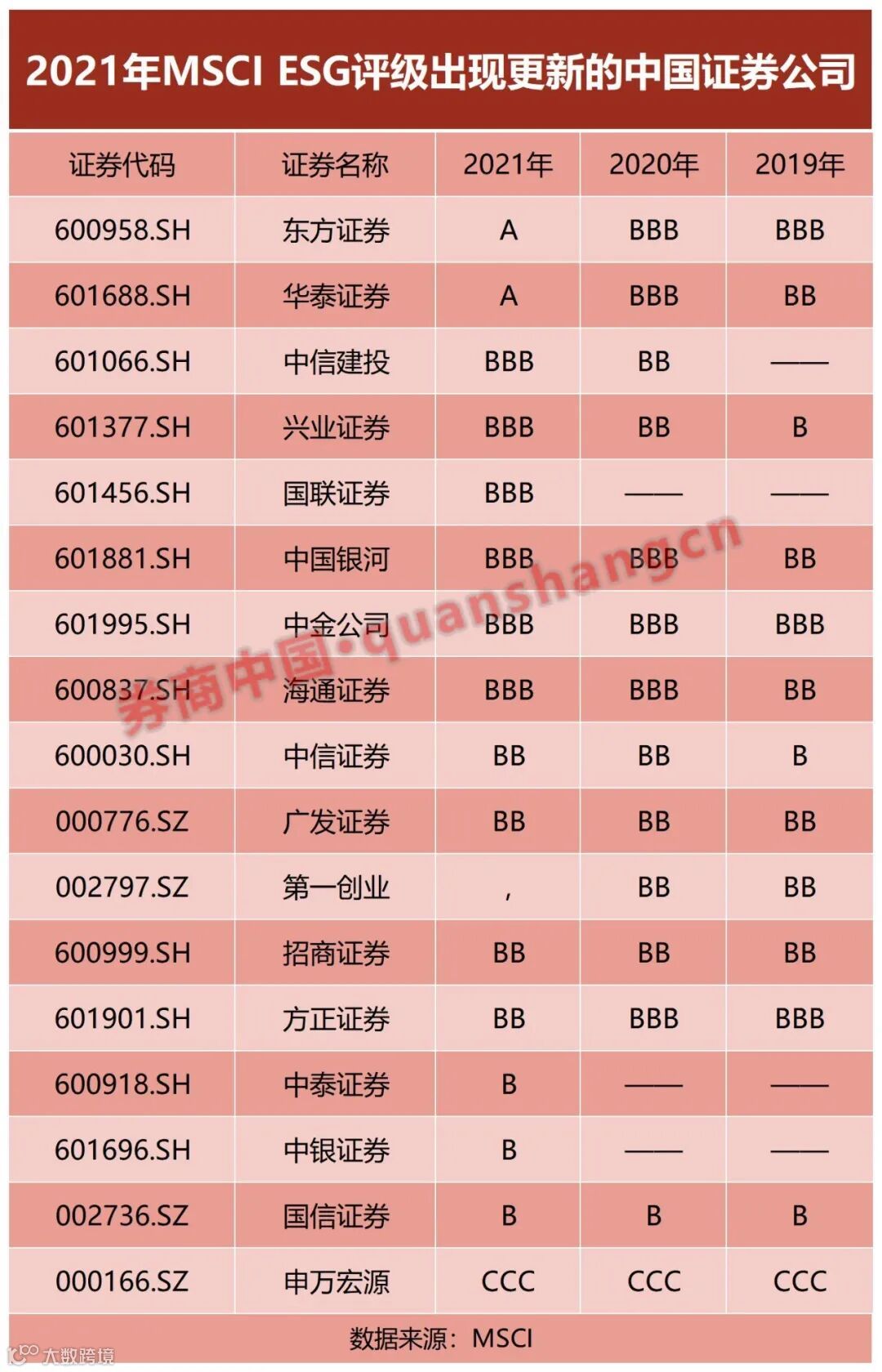 另有券商首次获得MSCI ESG评级。根据MSCI官网,中泰证券与中银证券去年首次获得ESG评级,均为B级。国联证券也同样首次获评,为BBB级。
