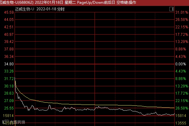 1月18日,未盈利生物科技企业迈威生物在科创板挂牌上市,开盘报32元,较发行价34.8元跌8.05%,而后股价持续下跌,截至收盘,迈威生物收报24.5元,股价跌幅达29.6%。收盘报价,股民中一签将亏损5150元。