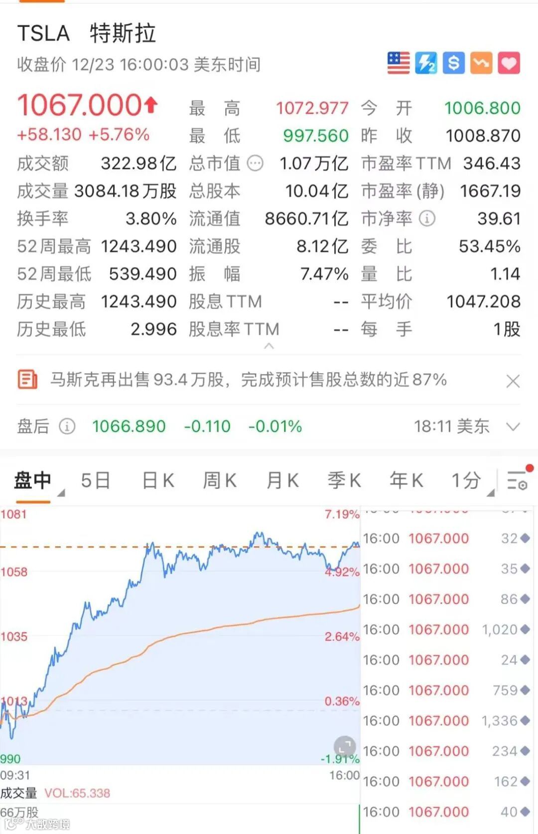 继周三特斯拉股价暴涨7.49%,股价站上1000美元大关之后;周四特斯拉再度上涨5.76%,最新收盘价为1067美元,总市值达到1.07万亿美元。