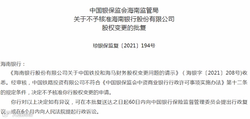 12月15日,海南银保监局发布公告称,经审核,中国铁路投资有限公司(下称“中国铁投”)不符合《中国银保监会中资商业银行行政许可事项实施办法》第十二条的规定条件,决定不予核准该行股权变更的申请。