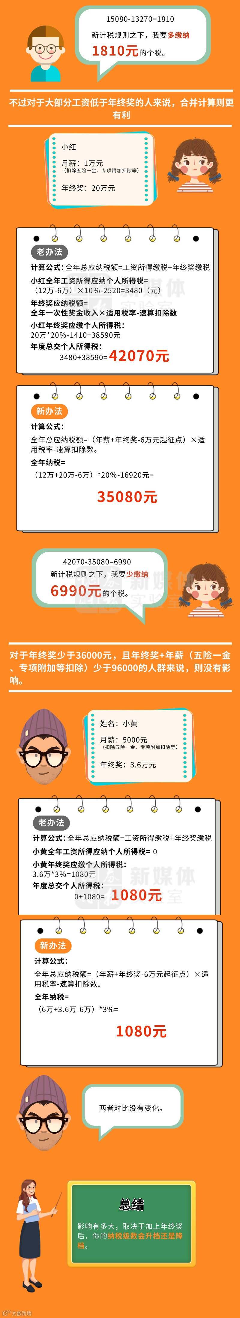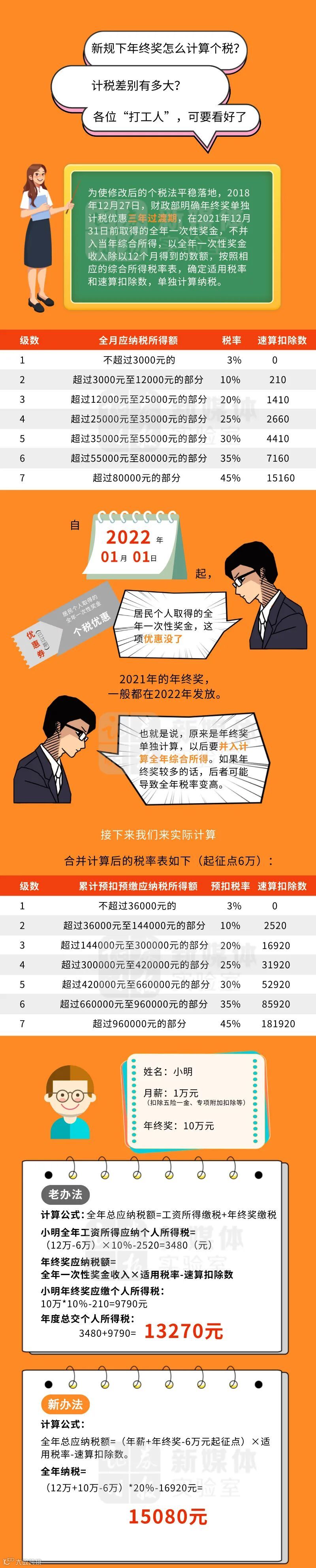 新规下年终奖怎么计算个税?计税差别有多大?年终奖会变多还是变少……我们通过以下长图来一一厘清。