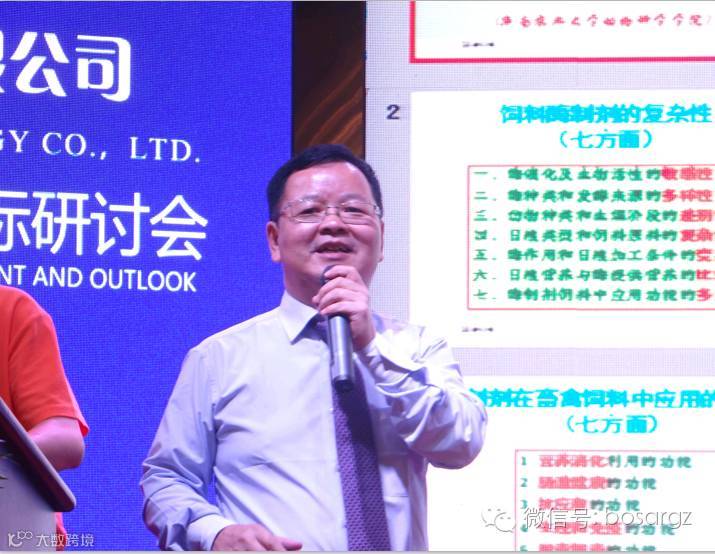 冯定远教授为大家讲解了饲料酶制剂未来研究的几个重点领域,包括饲料酶制剂的复杂性以及酶制剂在畜禽饲料中的应用功能,重点讲述了饲料酶制剂的研究新领域,冯教授重新讲述了配合酶,组合酶的概念,并多次提到很赞同我司张博士的理念,他说这也代表着我们酶制剂的生产企业也在不断的进步,他很开心看到这一现象。