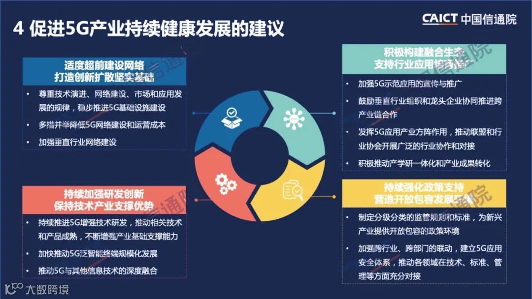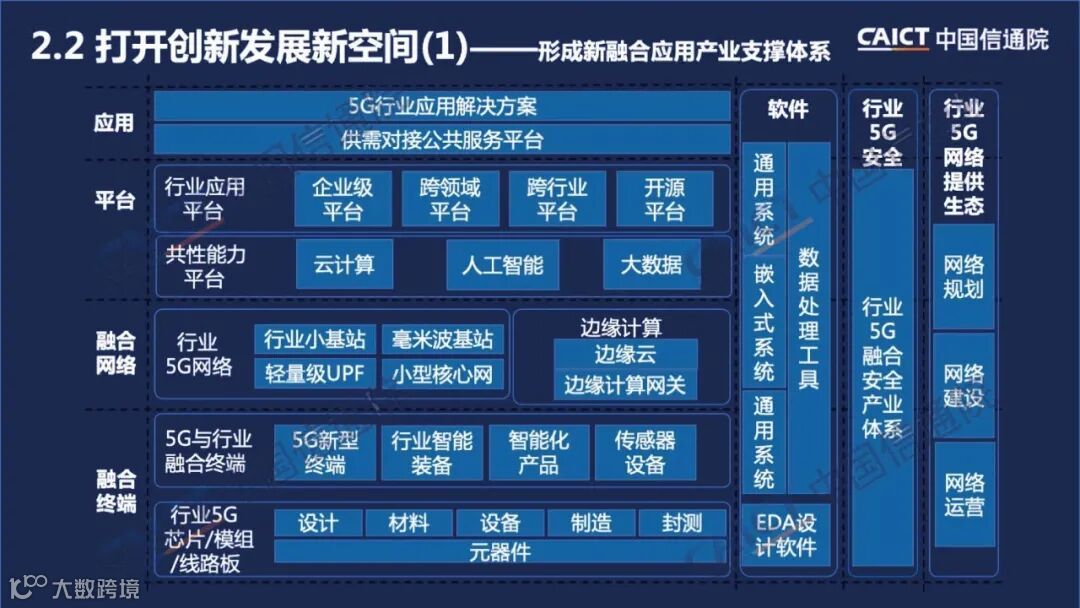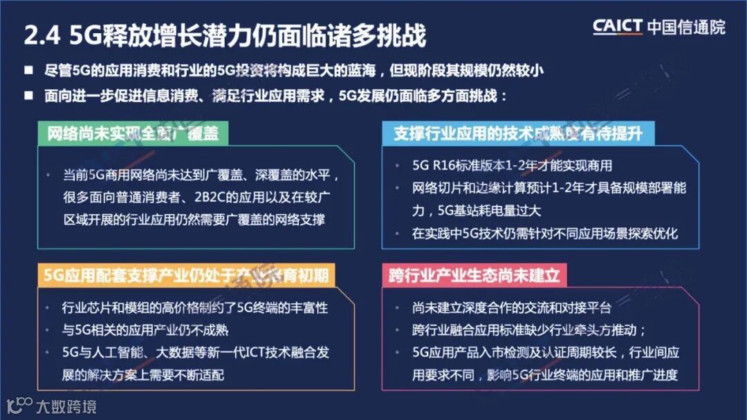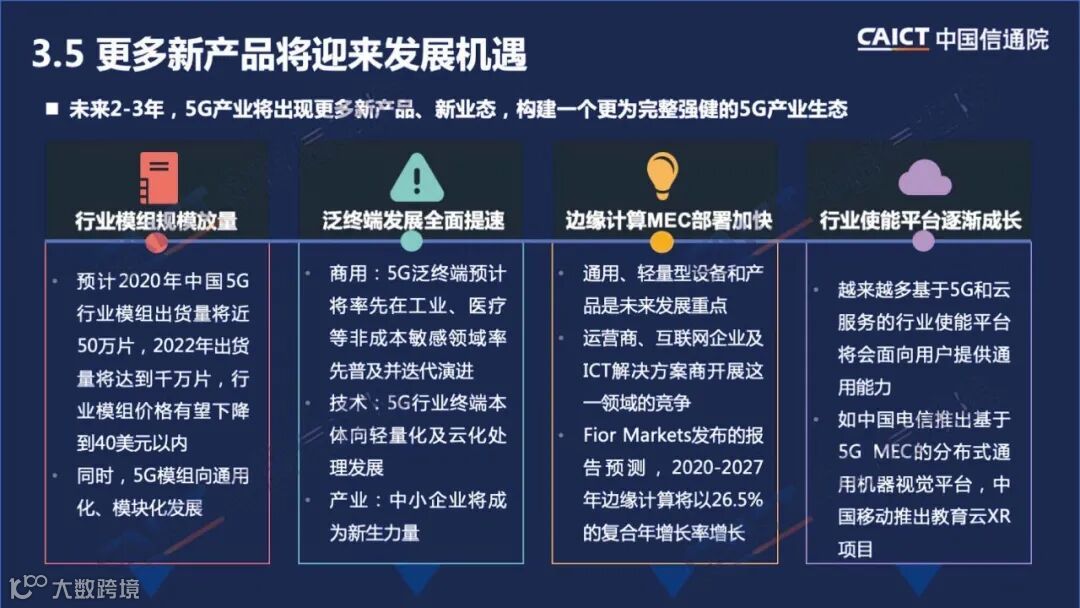 但我们仍应客观看到5G释放增长潜力仍面临诸多挑战:一是5G网络尚未实现全国广覆盖;二是5G支撑行业应用的技术成熟度还有待提升;三是应用配套支撑产业仍处于培育初期;四是跨行业产业生态尚未建立。因此,未来2~3年5G产业发展将进入关键期。这一时期,既是5G应用生态的培育期,也是各厂商积蓄实力、加速转型成长的重要窗口期。预计未来2~3年,我国5G网络建设仍将呈持续推进趋势,逐步实现广域覆盖,具有5G特性的消费级创新应用可能在2022-2023年规模增长,行业应用仍将处于导入期并分批次逐步落地商用,行业应用技术支撑能力显著提升,更多新产品将迎来发展机遇。产业转型之风已起,需产业界同仁齐心努力。