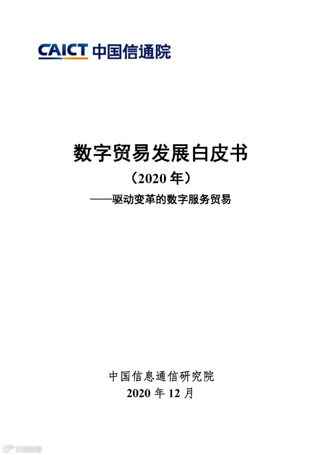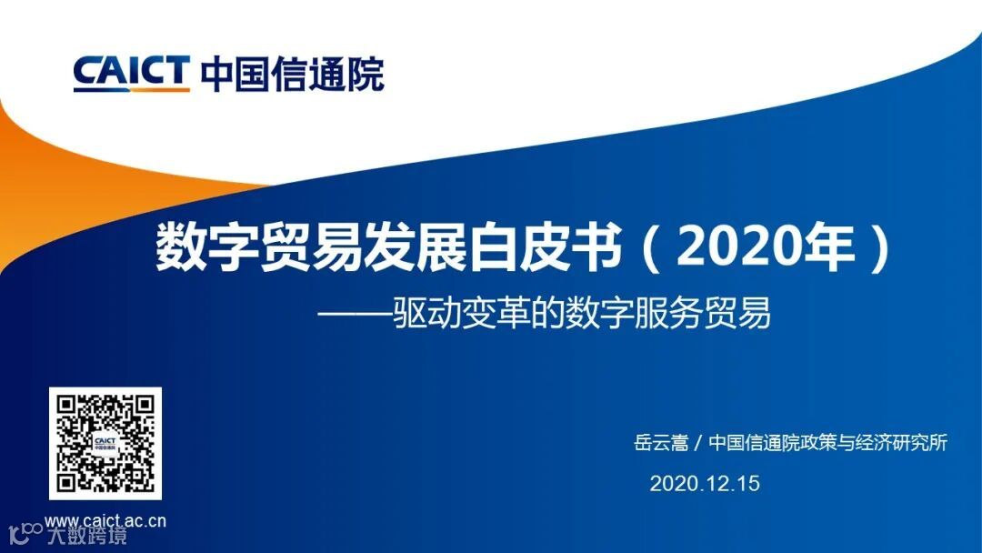 2020年12月15日,在“2021中国信通院ICT+深度观察报告会” 数字经济分论坛,中国信息通信研究院(以下简称“中国信通院”)政策与经济研究所高级工程师岳云嵩发布了《数字贸易发展白皮书(2020年)》。这是中国信通院发布的第二本数字贸易白皮书,进一步明确了数字贸易概念内涵与研究框架,并重点分析了全球数字贸易发展现状趋势、关键技术服务和典型应用场景,希望为我国数字贸易发展提供有益参考。