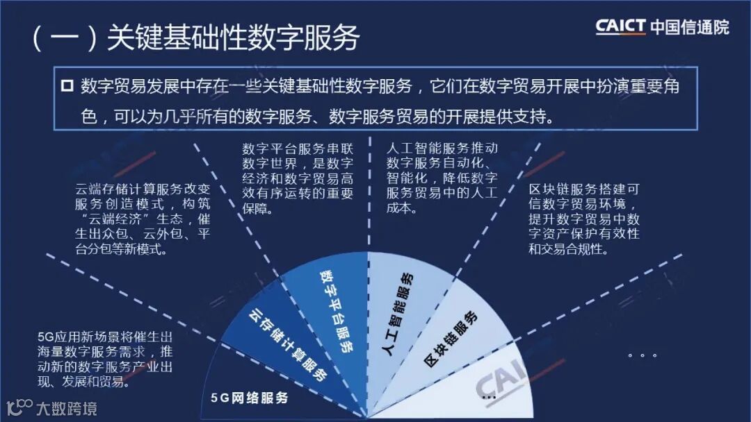 数字贸易发展中存在一些关键基础性数字服务,它们在数字贸易开展中扮演重要角色,可以为几乎所有的数字服务、数字服务贸易的开展提供支持,如5G网络服务、云存储计算服务、数字平台服务、人工智能服务、区块链服务等。