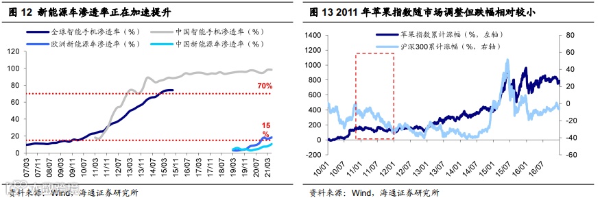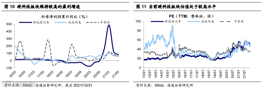 22年利润增速绝对值高但相比21年回落,估值消化契机是市场调整。2021年新能源车、光伏风电和半导体等硬科技板块表现亮眼,以公募基金为代表的机构配置比例较高,投资者关心2022年硬科技板块涨幅是否能够依然居前。对此我们从盈利和估值的匹配度来分析,首先硬科技板块的盈利增速确实要高于全A,根据Wind一致预期,21Q3/21E/22E新能源车产业链的归母净利润累计同比为83.1%/105.0%/ 42.5%,光伏风电产业链为54.1%/69.1%/35.5%,半导体产业链为67.5%/65.7%/28.5%,明显高于全部A股的25%/30%/5%。但是从趋势上看,硬科技板块的盈利增速在下滑,同时估值已经处于历史较高水平,截至2021/12/31新能源车产业链PE(TTM,下同)/13年以来自下而上分位数为48.9倍/92.8%,光伏风电产业链为48.5倍/70.3%,半导体产业链为35.7倍/65.2%。2022年硬科技板块的表现依赖于市场环境的变化,对此我们在《借鉴智能手机看新能源车产业演变-20210906》中指出过,2021年新能源车产业链类似2010年苹果产业链,高景气支撑高估值,但2011年苹果指数盈利有所下滑,随着市场整体调整苹果指数也同步消化估值。因此,我们认为新能源车等硬科技板块也会经历估值消化的阶段,但需要等市场环境改变,今年一季度市场有望延续上升趋势,未来市场如果出现调整则需要警惕这种情况的发生。