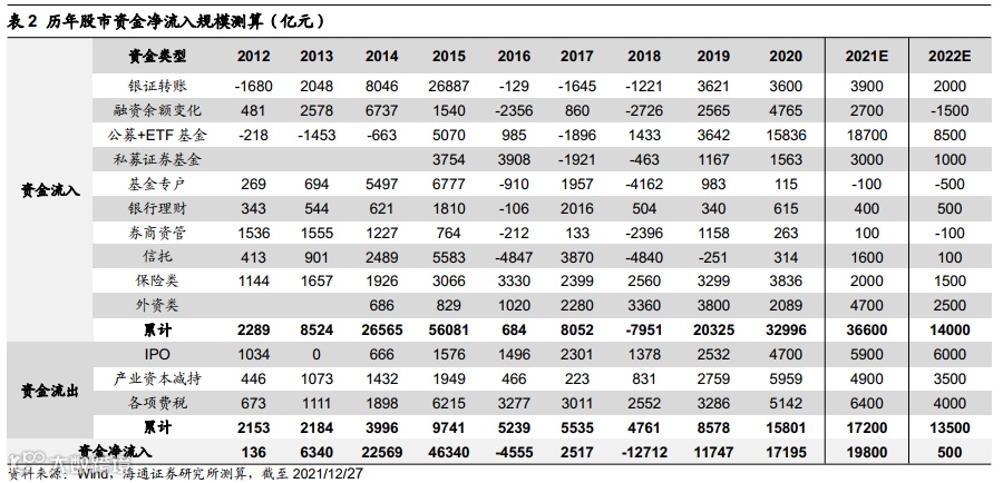 资产配置向权益迁移的长期趋势不变,22年股市资金供求偏平衡。最近三年以来资金持续流入股市,大家已经慢慢习惯了资金从房市向股市迁移,那么明年这种迁移趋势会继续吗?到底有多少资金流入股市呢?这也是大家关心的一个重要话题。在《股市资金供求偏平衡——2022年A股展望系列6-20211231》中,我们提到从长期维度看过去长久以来我国居民的资产配置结构明显重房产轻权益。对比各国居民的资产配置情况,2019年我国居民的权益类(股票、基金等)资产配置比例仅为2%,远低于美国的34%、德国的12%、日本的9%。长期看,我国居民资产配置有望趋势性地从房市转移至股市,核心原因是:一是我国主导产业正从过去的以地产为主转向以科技服务业为主,二是我国人口平均年龄从2000年的31岁升至2020年的38.8岁,居民对地产的刚需配置力度将趋势性下降。但是,短期而言,资金入市节奏与市场行情有关,历史经验显示牛市资金净流入,熊市资金净流出,震荡市紧平衡。对于22年的A股,我们认为首先岁末年初的跨年行情值得期待,但从全年的视角来看,A股在经历19-21年三年上涨后或将在22年迎来阶段性的休整,背后是通胀高位和盈利周期性回落的双重扰动。从而,我们认为2022年的资金面可以参考A股历史上的震荡行情,我们预计22年全年流入幅度相较21年或将大幅放缓,整体上资金流入流出项偏平衡,具体测算数据如下。
