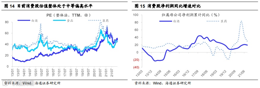 当前估值中等偏高、业绩增速回落,大机会还需要等待。消费股曾经是公募基金的心头好,是2019年和2020年配置比例最高的板块,然而最近一年大消费走势较弱,近期以白酒为代表的消费股迎来一波反弹,那么消费股是否出现了配置价值呢?整体上,我们认为目前消费股估值处于历史中等偏高水平,同时2022年业绩增速偏低,整体机会还需要耐心等待。从估值看,2021年初白酒PE(TTM,整体法,下同)最高达到71倍,此后估值不断下移,截止2021/12/31,白酒PE为47.9倍,处于2005年以来估值从低到高的85%分位,2021年初食品PE最高达到67倍,此后估值逐步回落,目前食品PE为44.6倍,处于2005年以来估值从低到高的72%分位,2021年初医药PE最高达到85倍,此后估值不断回调,目前医药PE为46.2倍,处于2005年以来估值从低到高的69%分位,整体上,消费股估值处于历史中等偏高水平。从业绩看,历史经验显示国内经济企稳回升增长后,消费数据才会好转,前文我们提到2022年经济下行压力较大,所以消费股短期业绩难见较大改善。具体而言:21Q3白酒净利润累计同比为19%,行业分析师预测2022年净利同比增速为15%,医药为29%、5%。可见,目前大消费板块估值并不便宜,结合2022年业绩增速偏低,我们认为全年消费股行情以震荡为主。