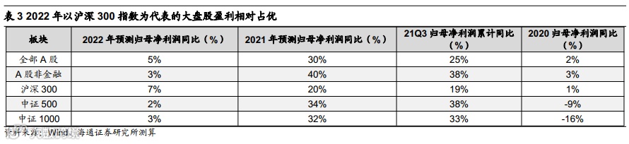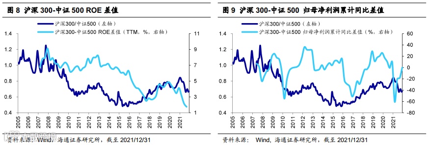 22年价值、大盘略占优,沪深300强于中证500。2021年从指数层面看小市值占优,中证500表现好于沪深300,那么2022年市场哪一类风格会占优?我们在《风格:大盘与价值略优——2022年A股展望系列1-20211210》中分析过,风格变迁的背后是盈利相对趋势的变化。从历史上看,沪深300/中证500与沪深300-中证500 ROE差值、归母净利润累计同比差值走势较为一致,2021年中证500之所以占优也是因为沪深300-中证500 ROE差值下滑,即中证500相对盈利更强。此外,市场环境也是影响风格的重要因素,牛市阶段通常是成长与小盘占优,熊市阶段通常是价值与大盘占优,震荡市风格特征不明显。2021年依然处于牛市中,所以小盘风格表现更好。展望2022年,从盈利看,我们预计全年沪深300归母净利润同比为7%,中证500为2%;从市场环境看,我们认为A股在通胀高位和盈利周期性回落的双重扰动下或将迎来阶段性的修整。因此,在业绩相对占优且市场可能调整的情况下,2022年沪深300有望略优于中证500。