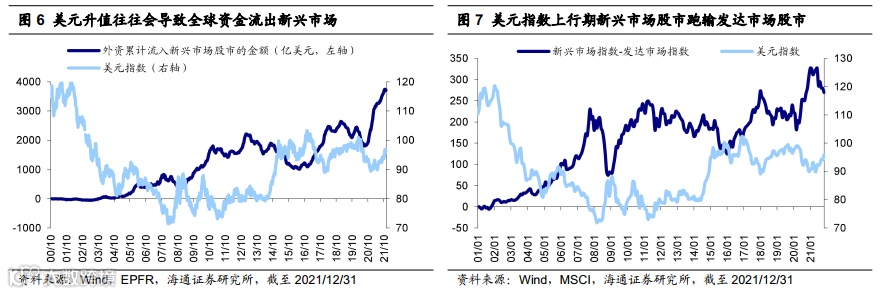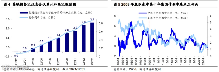 美联储有可能22Q2开始加息,届时中美国债利率有上行压力。目前市场上有投资者对2022年美联储加息会如何影响A股较为关注,我们可以借鉴历史来进行分析。首先关于美联储加息的时点,2021年12月美联储议息会议决定加快Taper,幅度是之前的两倍,按此推算2022年3月将结束Taper,同时美联储点阵图显示2022年预计加息三次。根据Bloomberg数据,目前市场预期今年5月之后美联储加息概率较大,我们认为二季度就需要警惕美联储加息。根据IMF预测,2022年全球GDP同比增速有望达4.9%,其中美国将达5.2%,全球经济复苏将推动国际定价的大宗商品价格上行,进而推升全球通胀预期,届时美联储可能会收紧货币政策,这将可能对A股造成冲击。历史规律显示,美联储加息初期A股往往会下跌,这是因为随着美联储开始加息,美国十年期国债利率中枢大概率上移,在全球经济同步性提升的背景下,我国国债利率也难以下行,从而制约A股估值。此外,美联储加息往往也会推升美元,进而导致全球资金流出新兴市场,新兴市场股市跑输发达市场股市。